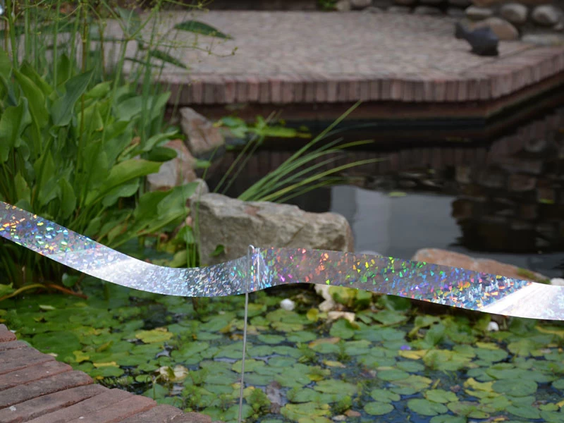 Reiher und andere Vögel sind geblendet von der Reflektion des Bird Blocker Band und halten sich fern. Das Set besteht aus 45 Meter speziellem holografischen Band und 10 Erdspießen aus Metall um eine Umzäunung um den Teich oder das Gemüsebeet zu machen. Es kann auch in einen Baum gehängt werden um z.B. Vögel aus Fruchtbäumen fern zu halten.