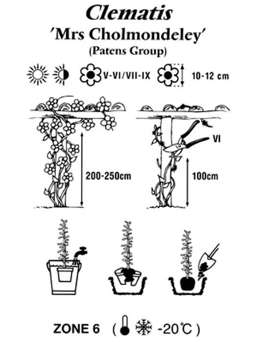 | Besonderheiten, Pflege: | Keine Staunässe. Bei der Pflanzung den Ballen eine Handbreit unter die Erdoberfläche setzen. Rückschnitt: siehe Pflanzung und Pflege von Clematis |