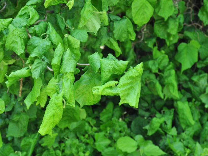 | Blatt, Holz: | Blatt breitrund, teilweise kräuselig eingerollt. Zweige korkenzieherartig gedreht. Sommergrün, im Winter blattlos. |