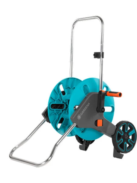 Der GARDENA Schlauchwagen AquaRoll M ermöglicht eine platzsparende Aufbewahrung des Gartenschlauchs und ist komfortabel in der Handhabung. Durch die ergonomische Kurbel mit Weichkunststoffkomponente lässt sich der Schlauch zuverlässig aufrollen. Kein Umfallen mehr durch den ausklappbaren Standfuß. Seine spezielle Form sowie der sichtbare Räder-Hochstand unterstützen zudem die Standsicherheit des Schlauchwagens. Zur platzsparenden Aufbewahrung wird der Standfuß einfach eingeklappt, der Griff nach unten geschoben und die Kurbel schnell eingeklappt.