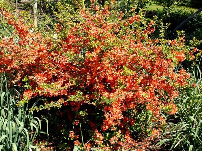 | Blüte: | Große orange-rote Blüten mit gelben Staubfäden, reichblühend am 3-jährigem Holz, Mai-Juni. |