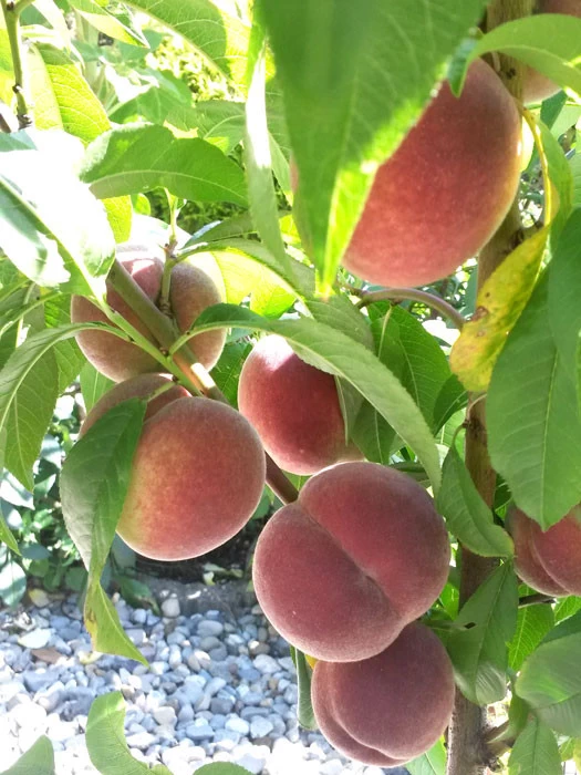| Frucht: | Groß, weissfleischig, saftig und sehr aromatisch mit pikanter Süße. Rotbackig mit gelbem Untergrund. Steinlösend. |