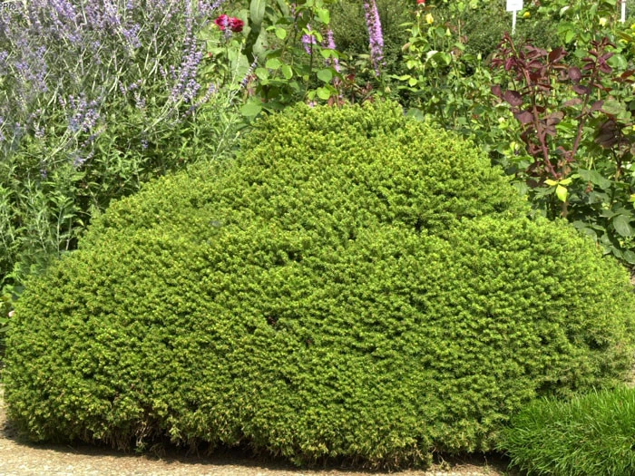 | Wuchs: | Zunächst kugelförmigig, später mehr flachkugelig und dicht wachsendes Nadelgehölz, mit von der Mitte aus schräg anstehenden Trieben und dünnen, dicht benadelten Zweigen. Wird 40 bis 50 cm hoch und 1 m breit. Jahreszuwachs ca. 5 cm. |