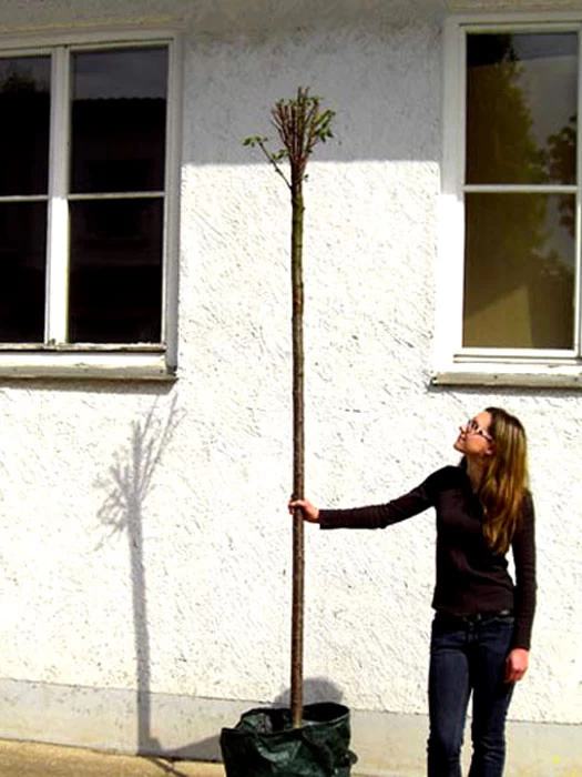 | Lieferqualität: | Junger Hochstamm mit einer Stammhöhe von ca. 2,20 m im Container. Mit einer auf dem Stamm aufsitzenden kleinen Krone, die im Lieferzustand fachgerecht etwas zurück geschnitten ist, um eine gute Kronenentwicklung nach der Verpflanzung zu gewährleisten. Stammhöhe: ca. 2,20 m |