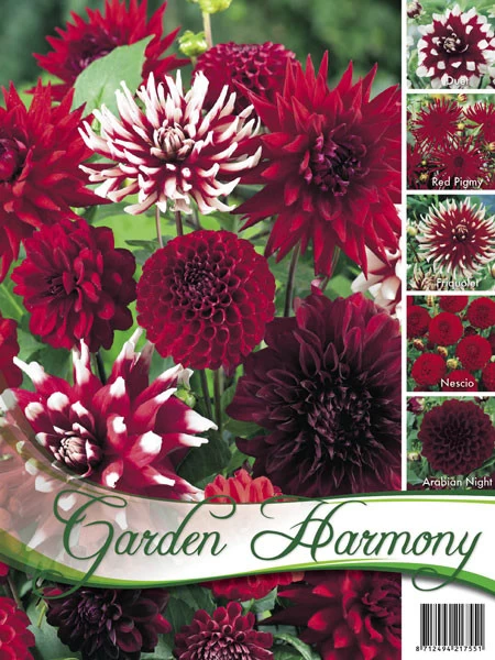 Das Sortiment besteht aus 5 Sorten roter Dahlien, die aufeinander abgestimmt sind.