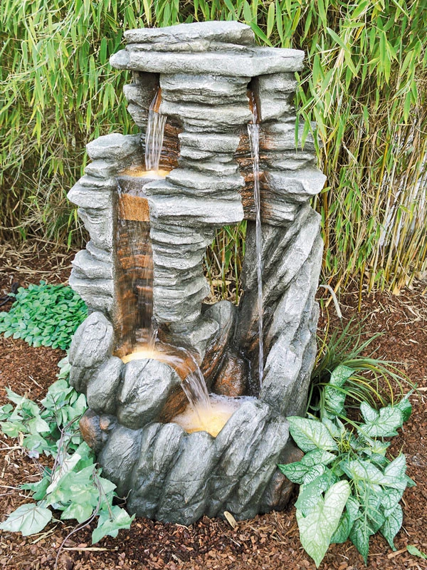 Das Wasser fließt über mehrere Kaskaden über den Stein-Dekor herunter. Das plätschernde Wasser entspannt Geist und Seele. Die Steinimitation wirkt so realistisch, als wären diese tatsächlich über Millionen von Jahren entstanden. Auch in der Nacht, dank LED-Beleuchtung, ein wahres Juwel für Balkon und Garten.