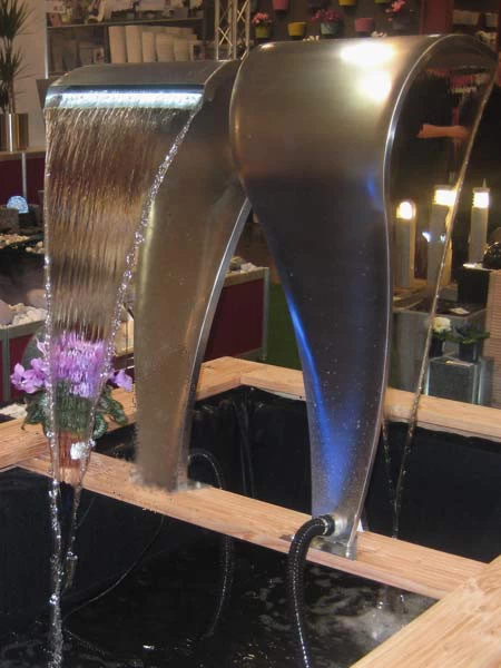 Der elegant geschwungene Wasserfall „Martinique“ eignet sich optimal zum Einsatz in der Flachwasserzone oder am Teichrand. Vier Bohrungen an der Unterseite ermöglichen die einfache Verschraubung auf festem Untergrund (z.B. Beton- oder Granit platte). Dank des chloridbeständigen und sehr hochwertigen Edelstahls ist er auch für den Einbau am Pool ideal geeignet.