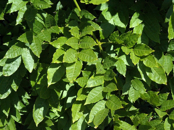 | Blatt, Holz: | Unpaarig gefiederte, bis 13-zählige, wechselständige Blätter, hellgrün, bis 30 cm lang, an langen Stielen. Sommergrün. |