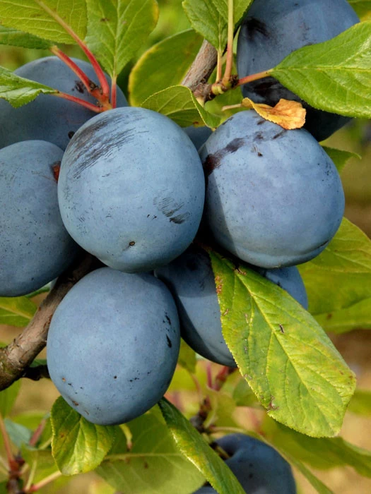 | Frucht: | Mittelgroß bis groß, länglich oval; Haut schwarzblau mit hellblauem Reif; Fleisch grünlichgelb bis goldgelb, fest, süß, saftig, gut steinlösend. |